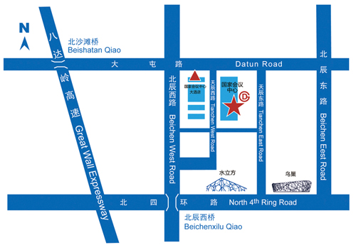 国家会议中心,位于北辰西路和大屯路交叉口。途经的公交线路主要有: